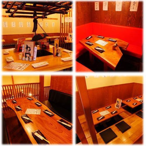 木目の落ちつた店内で囲炉裏を囲んだテーブル席・掘りごたつ席・個室をご用意!個室は6名~10名様までご利用可能です。フロア貸切もOK★普段使い~送別会・歓迎会・同窓会など各種ご宴会にぜひ!!限定2室!個室完備
